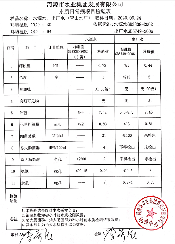 2020年6月24日水質(zhì)檢驗報告