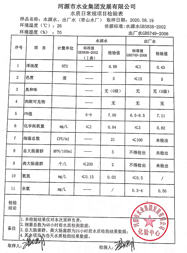 2020年8月19日水質(zhì)檢驗報告