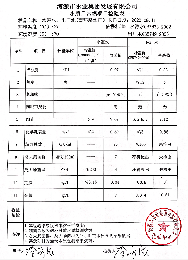 2020年9月11日水質檢驗報告