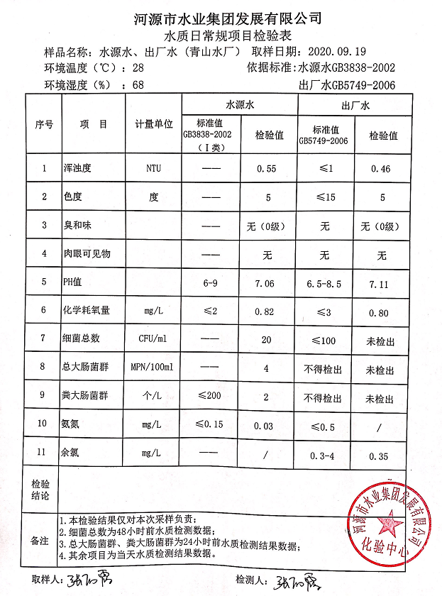 2020年9月19日水質(zhì)檢驗(yàn)報告