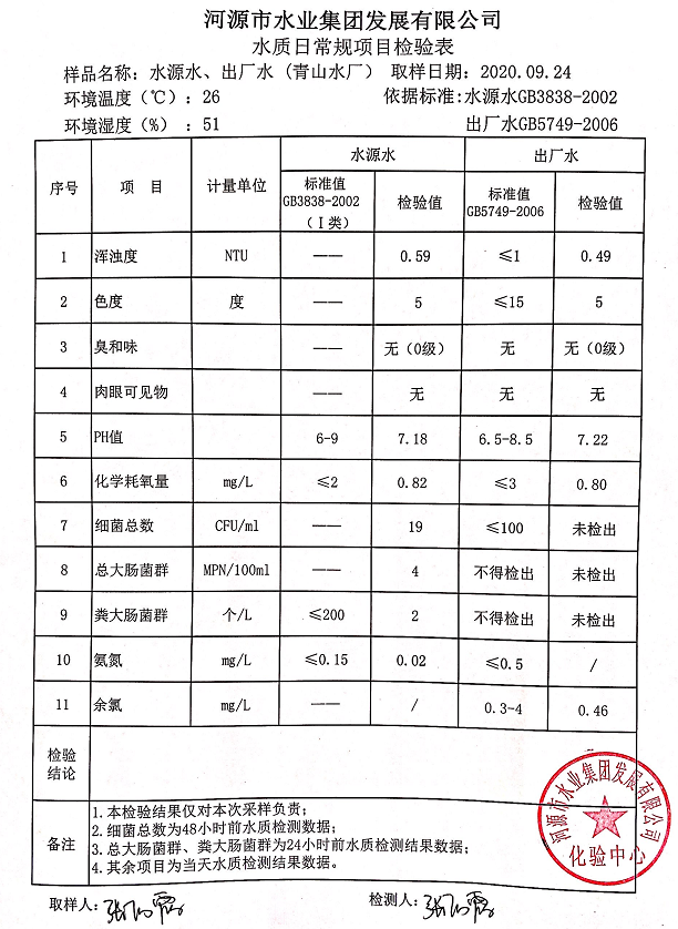 2020年9月24日水質檢驗報告