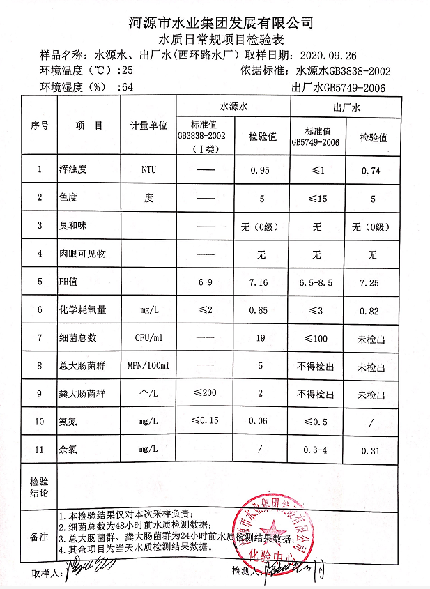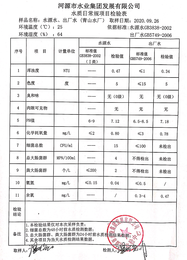 2020年9月26日水質檢驗報告