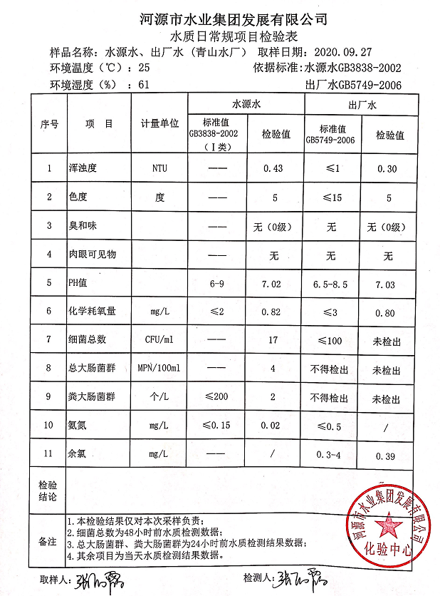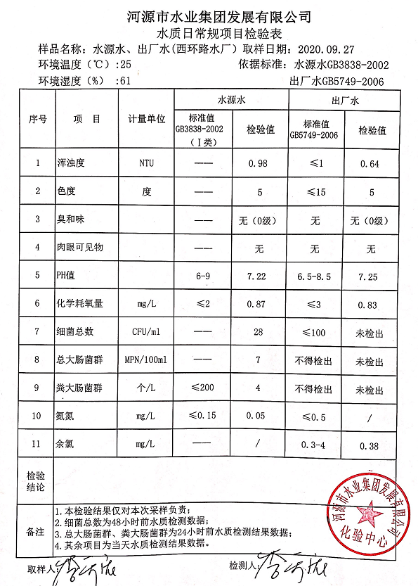 2020年9月27日水質檢驗報告