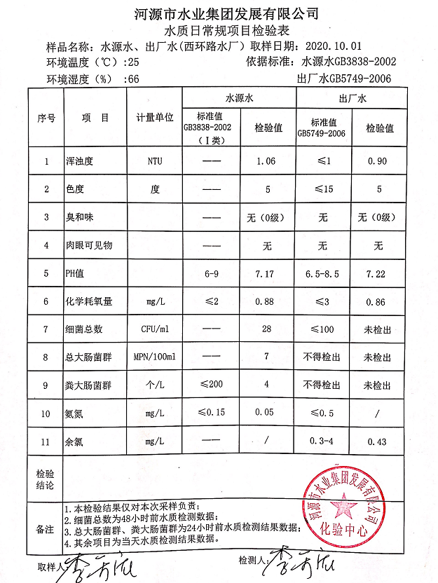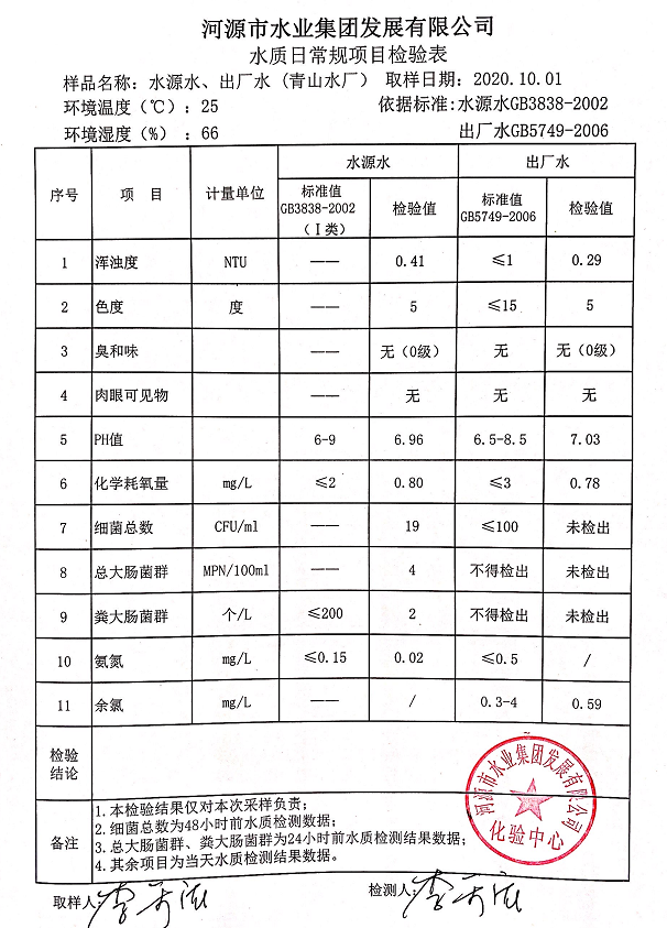 2020年10月1日水質檢驗報告