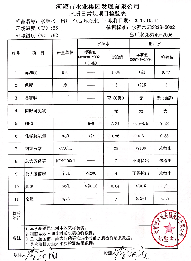 2020年10月14日水質檢驗報告