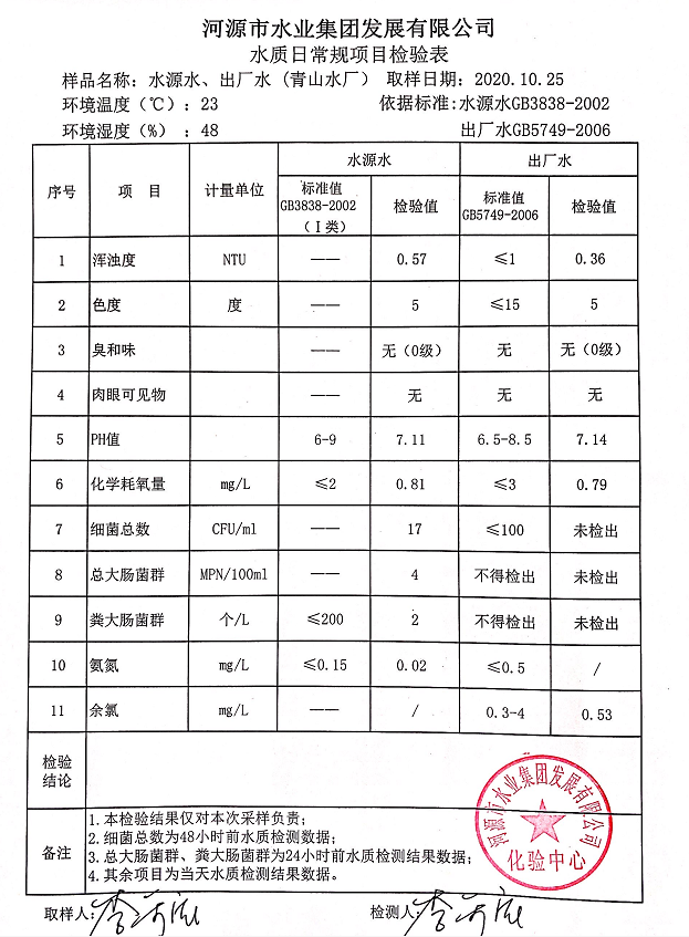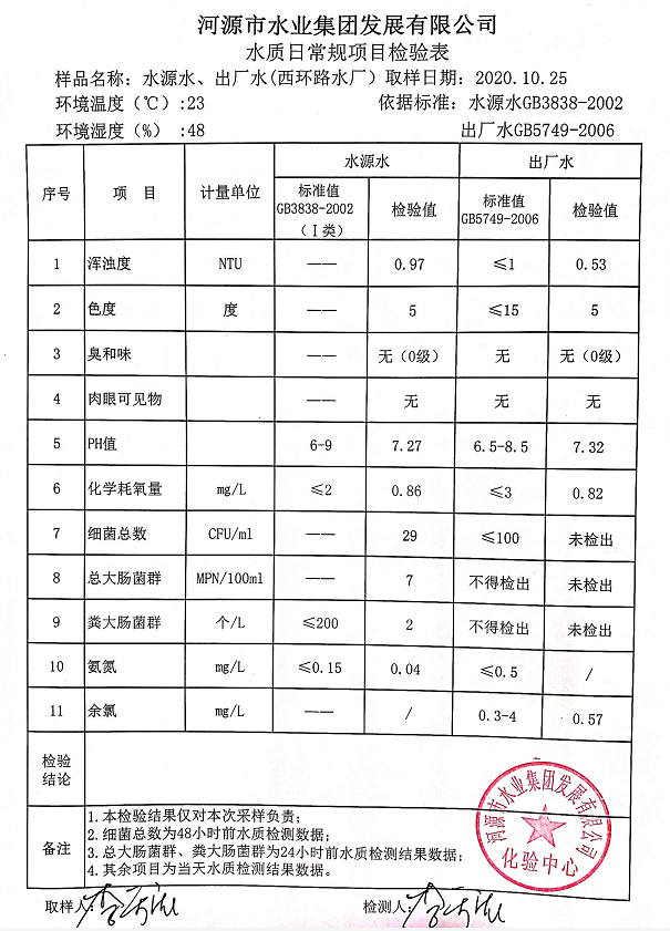 2020年10月25日水質檢驗報告