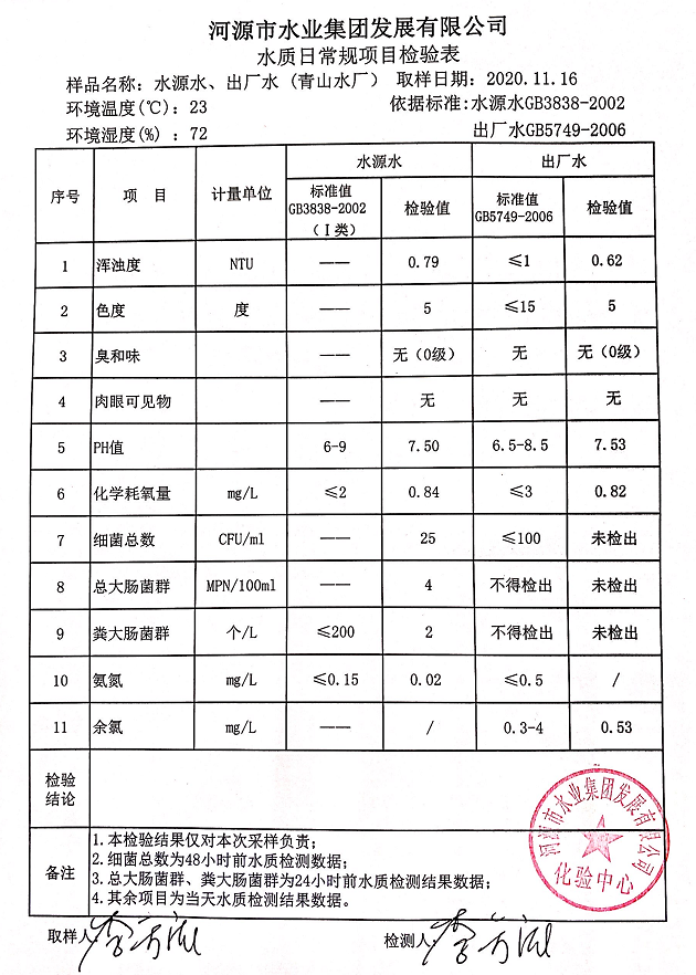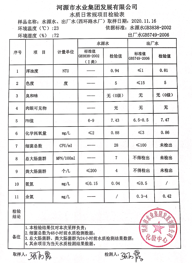 2020年11月16日水質檢驗報告