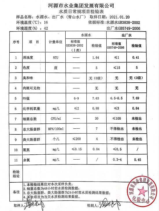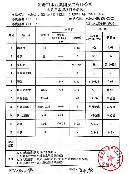 2021年1月20日水質(zhì)檢驗報告