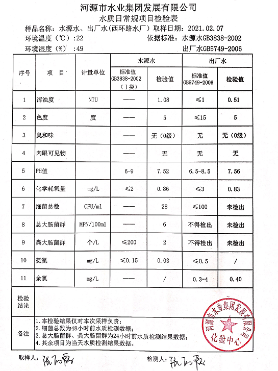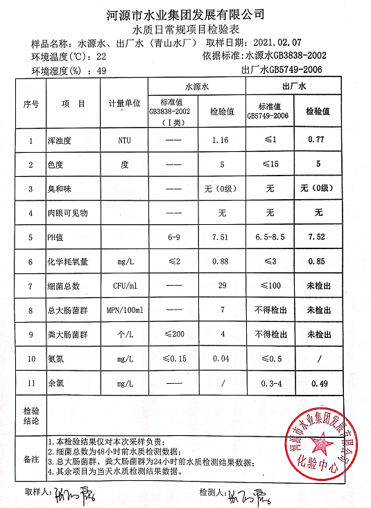 2021年2月7日水質檢驗報告