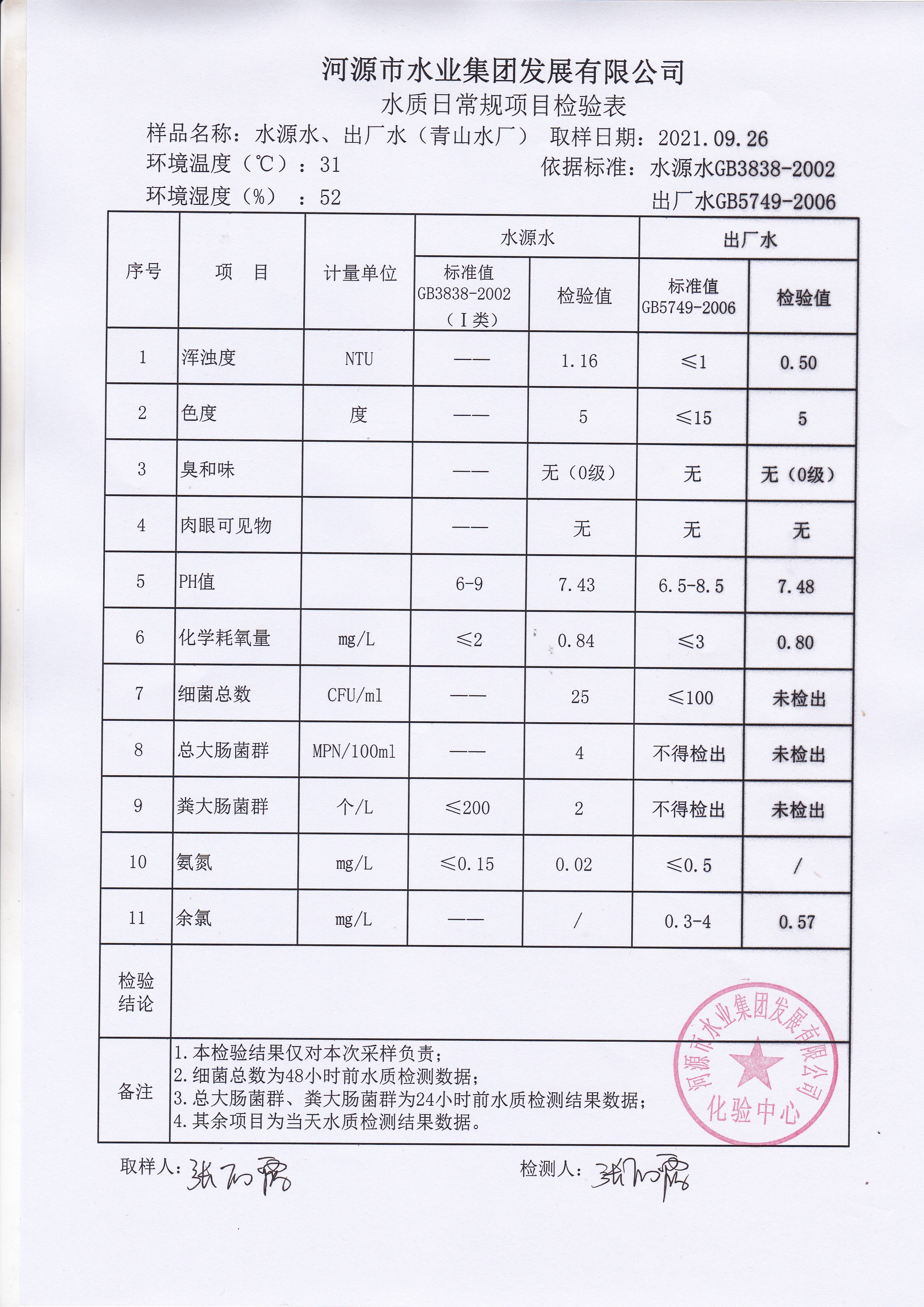 2021年9月26日水質檢驗報告