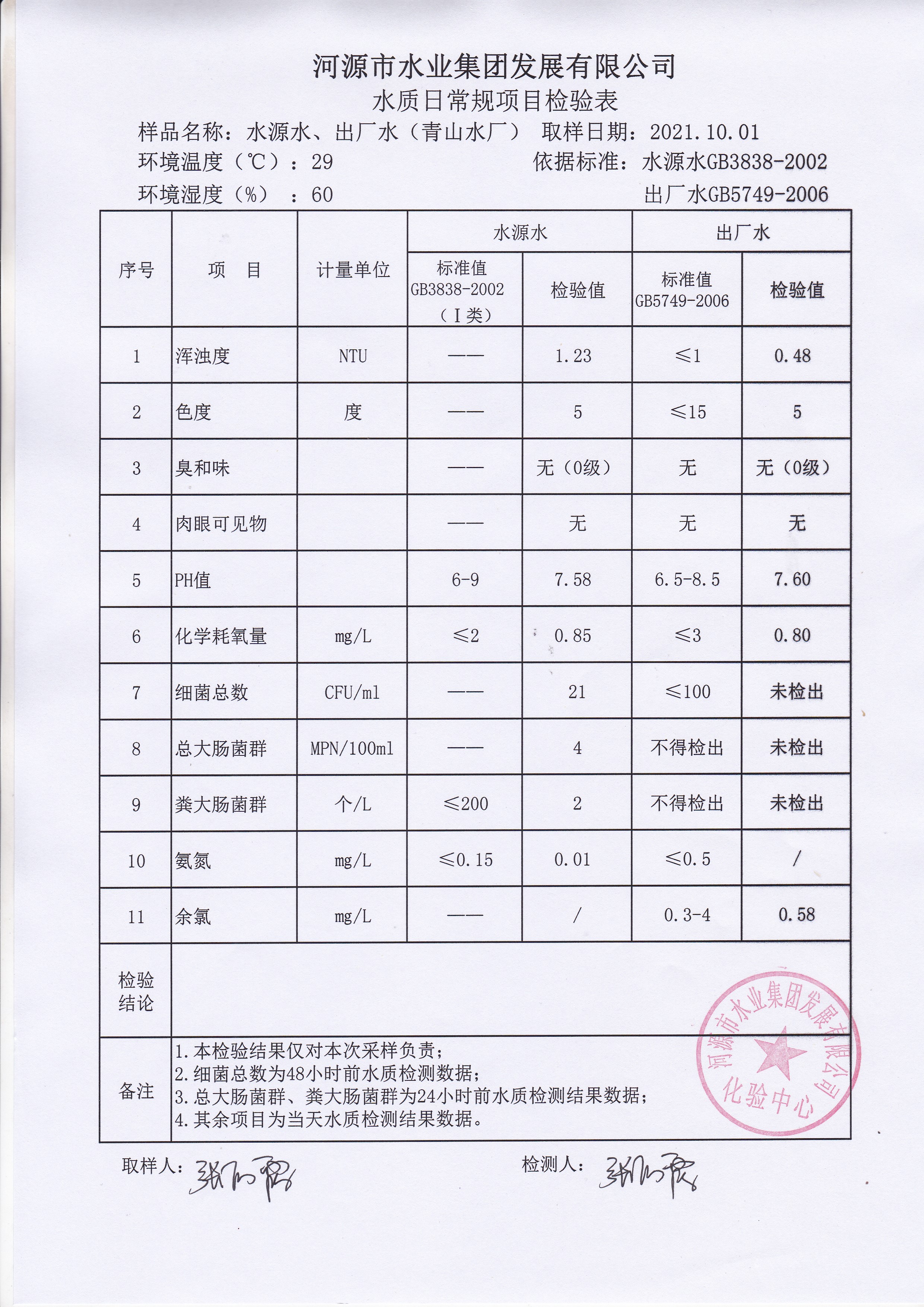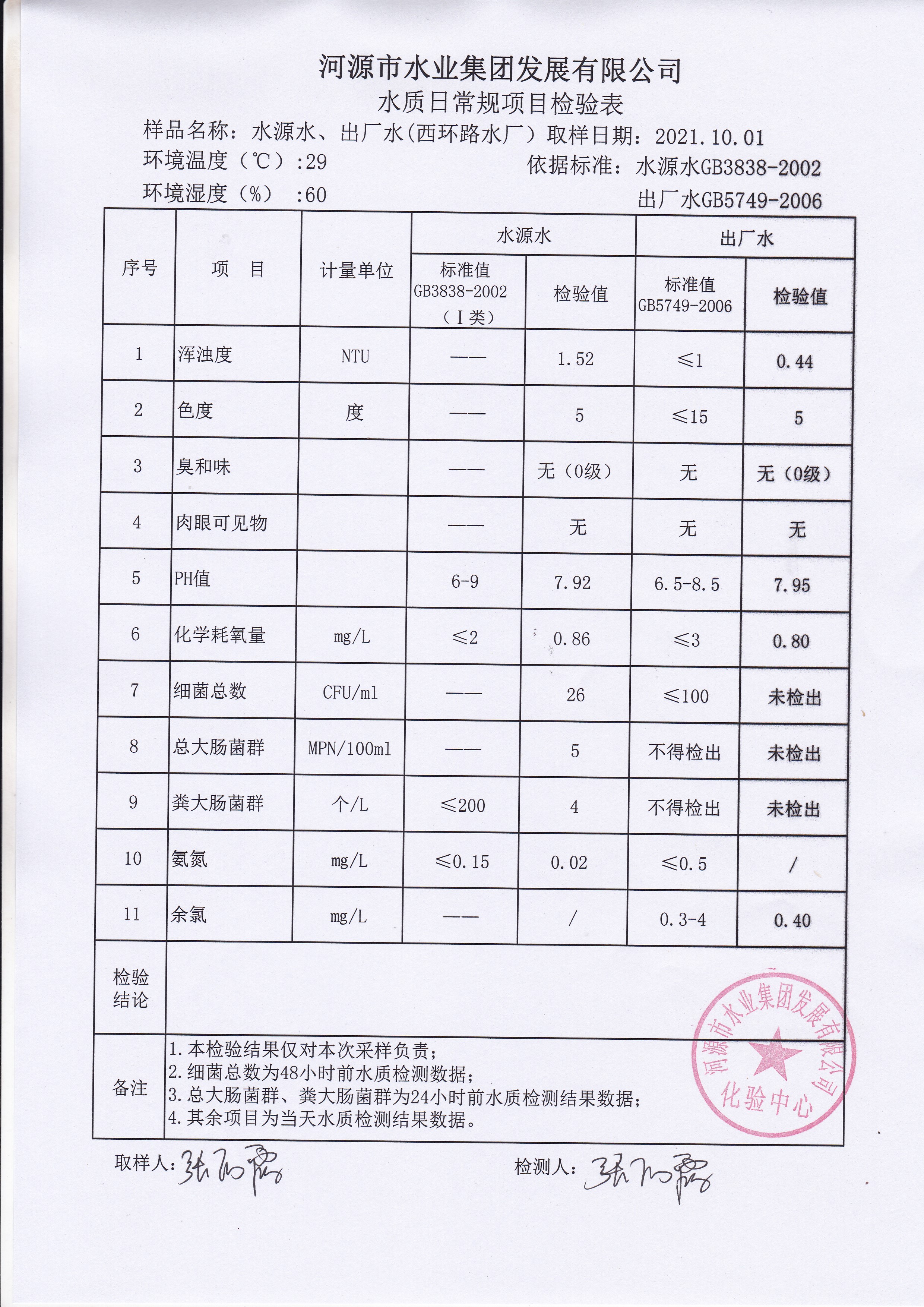 2021年10月1日水質檢驗報告