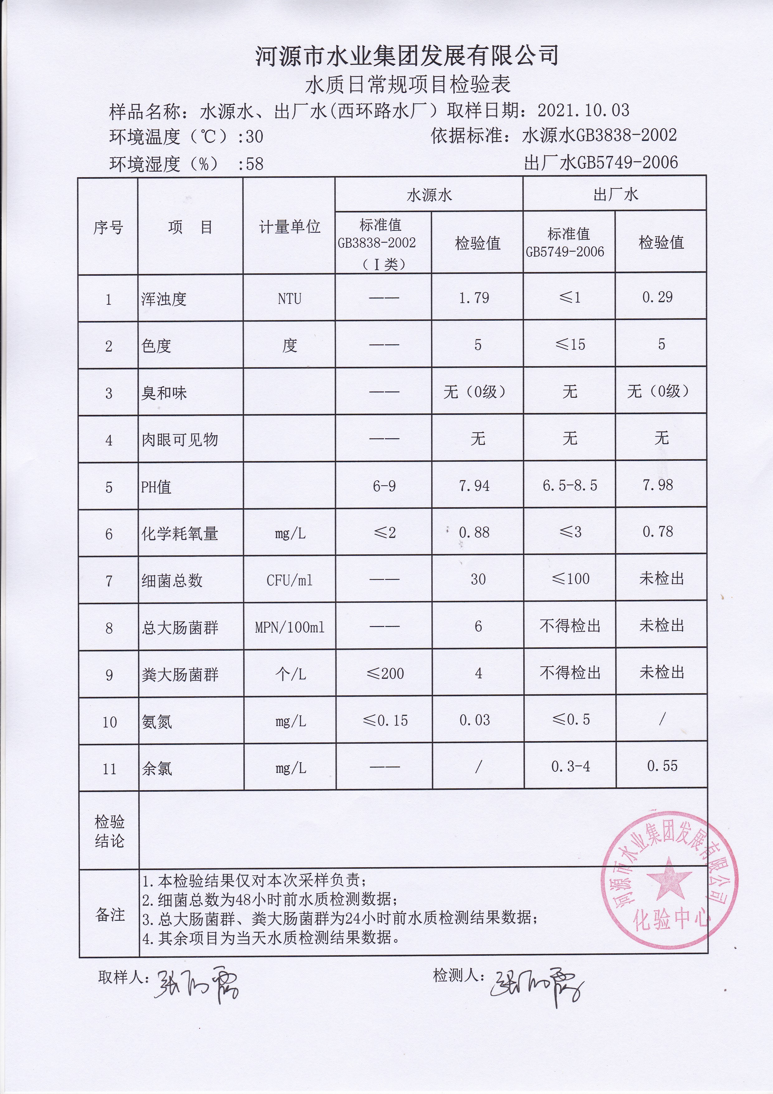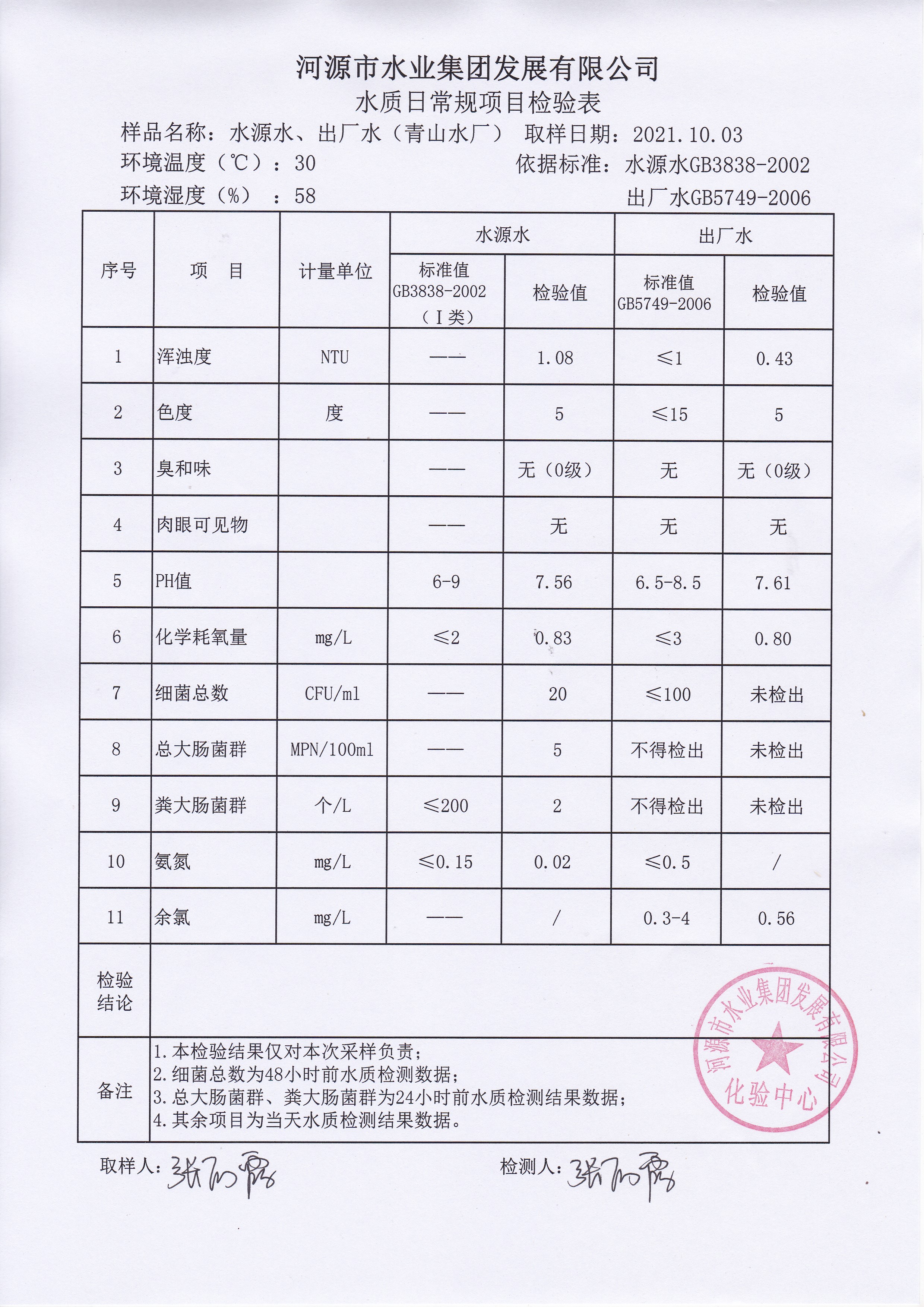 2021年10月3日水質檢驗報告