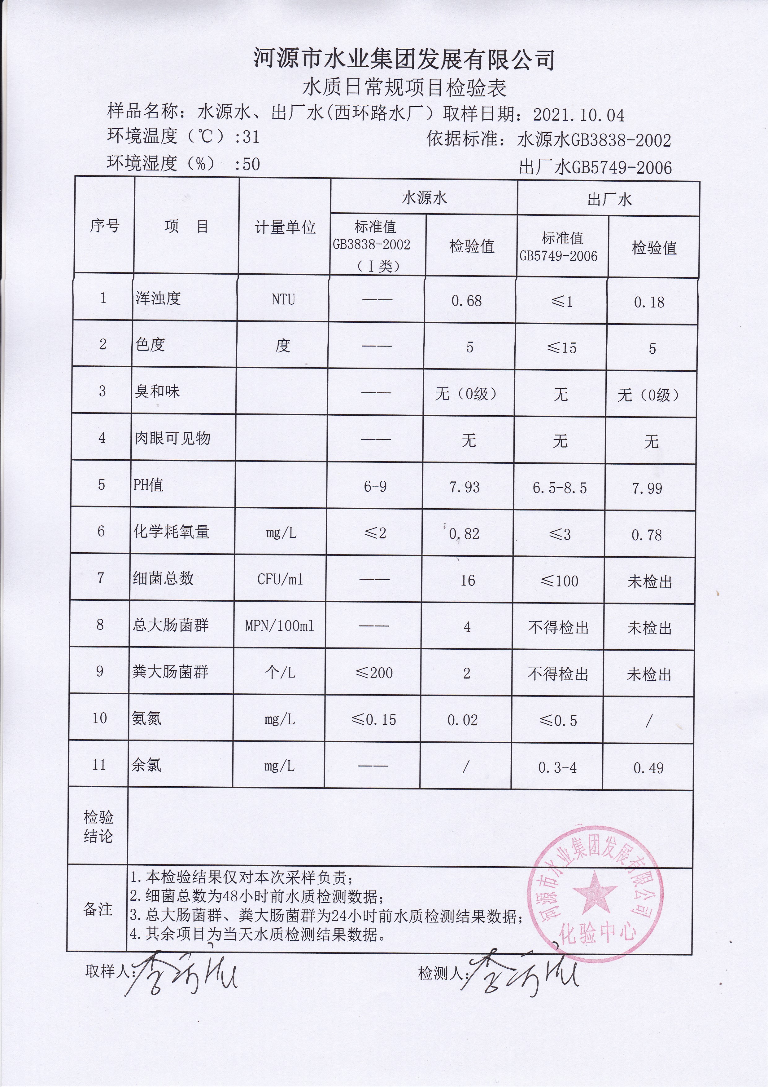 2021年10月4日水質檢驗報告