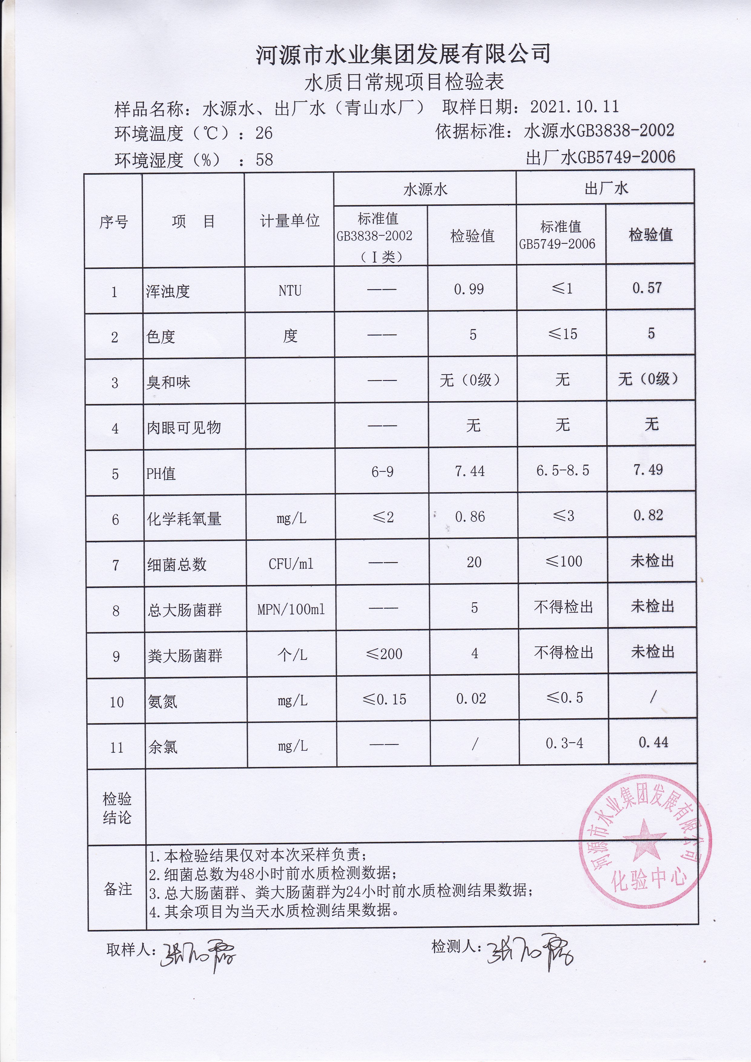 2021年10月11日水質(zhì)檢驗報告