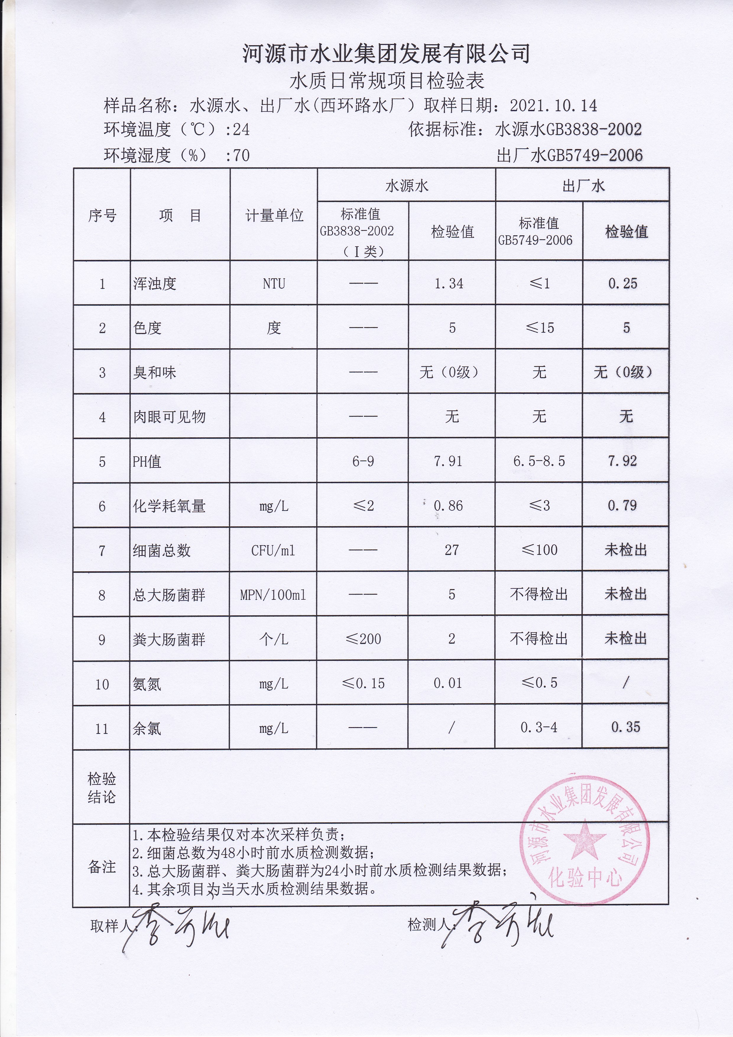 2021年10月14日水質檢驗報告