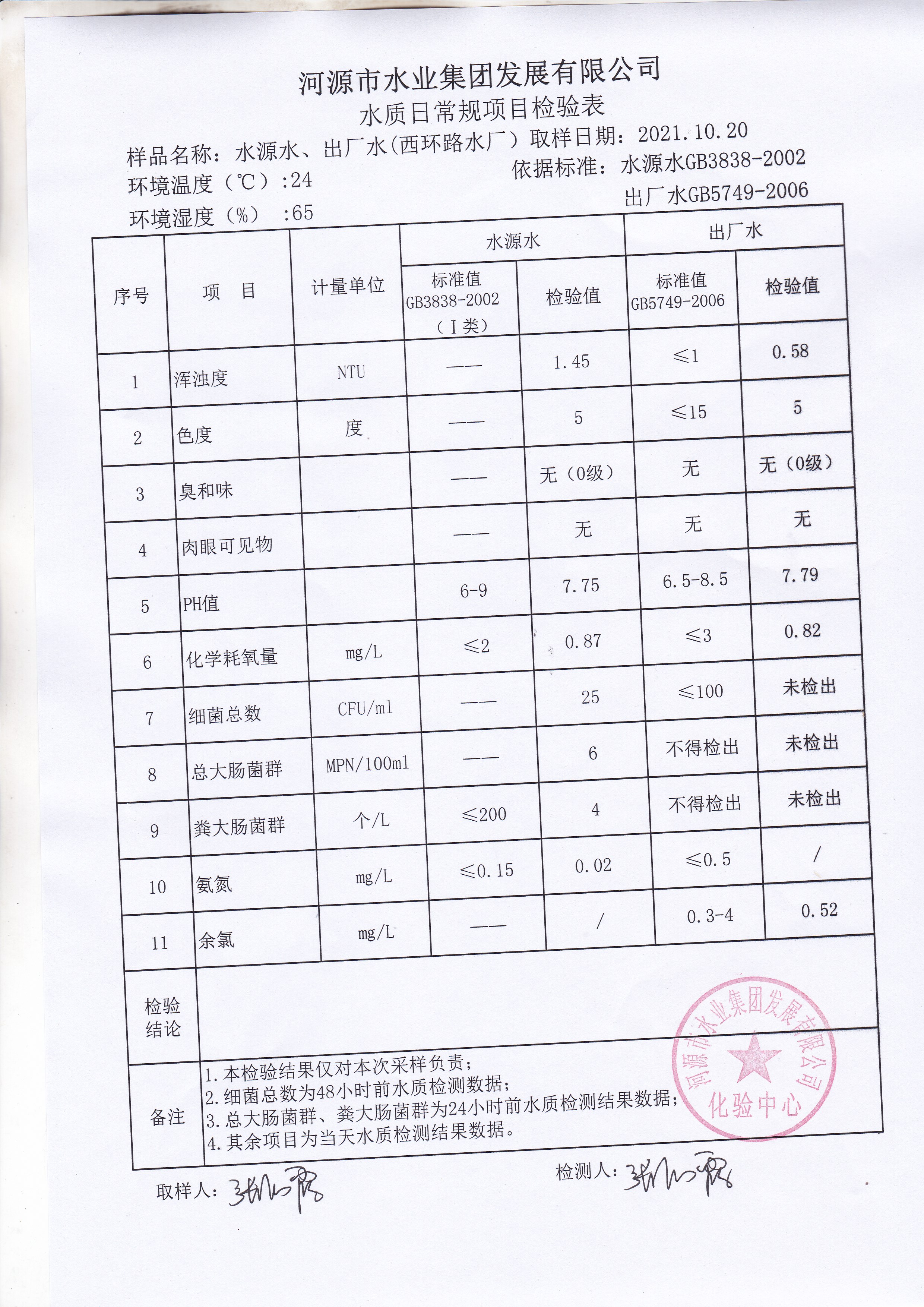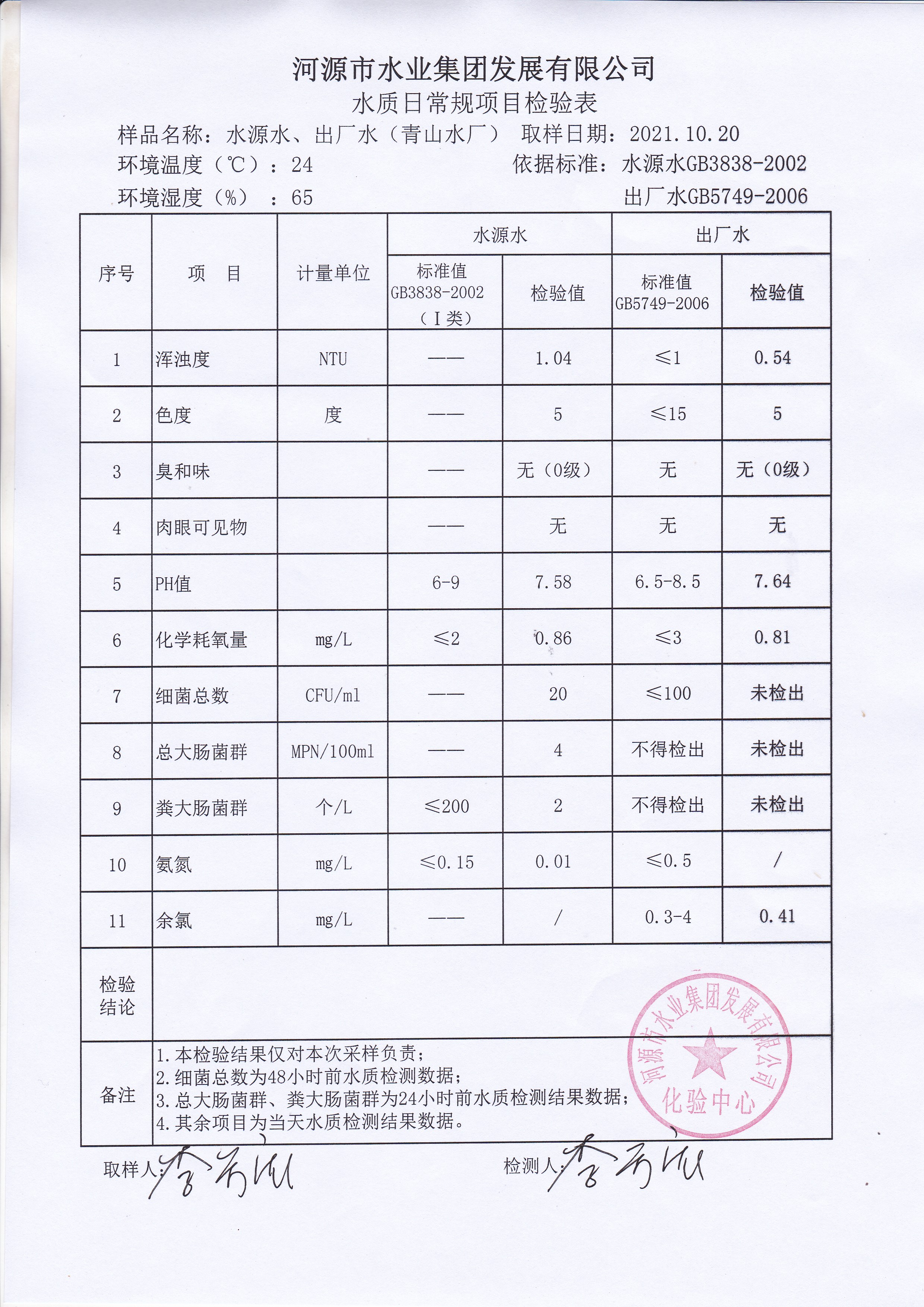 2021年10月20日水質檢驗報告