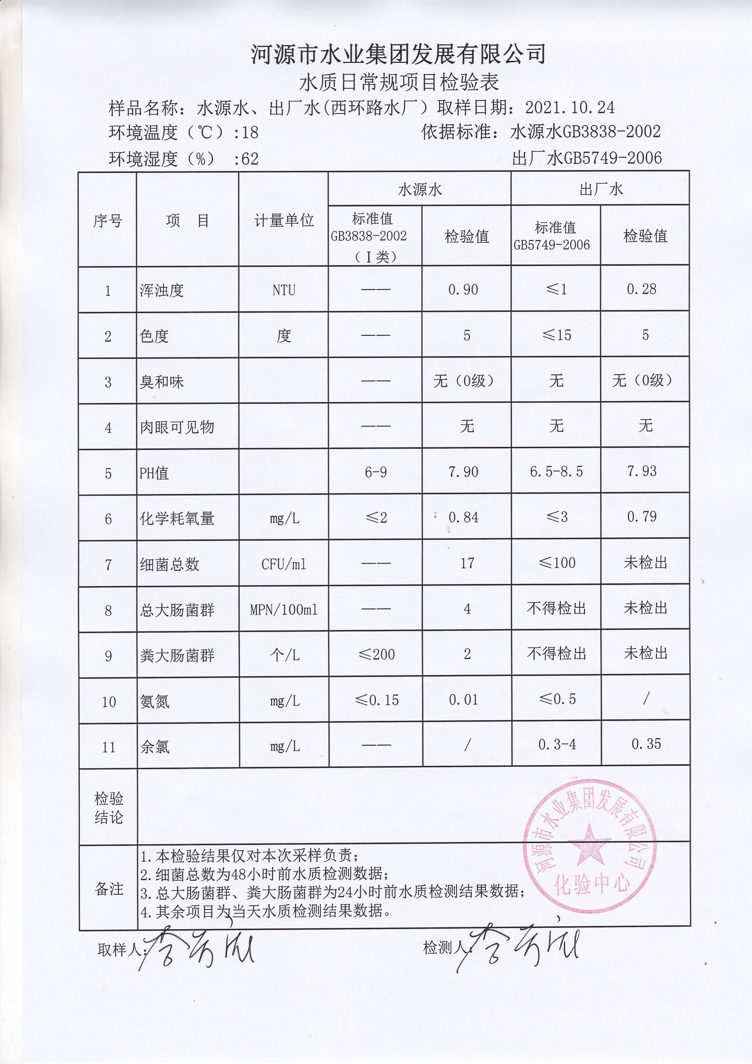2021年10月24日水質檢驗報告