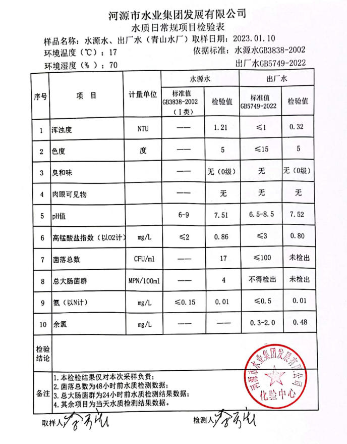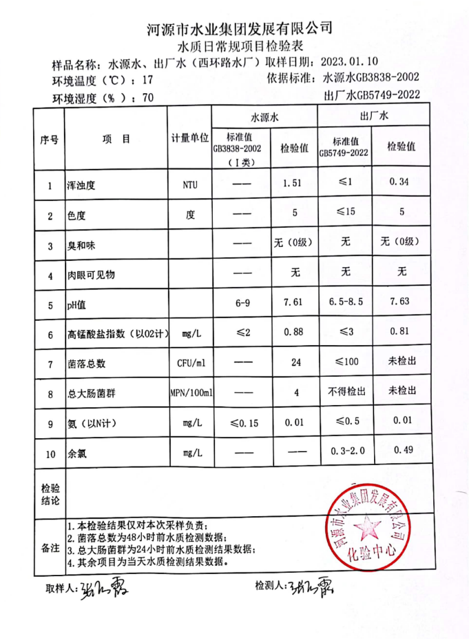 2023年1月10日水質(zhì)檢驗報告